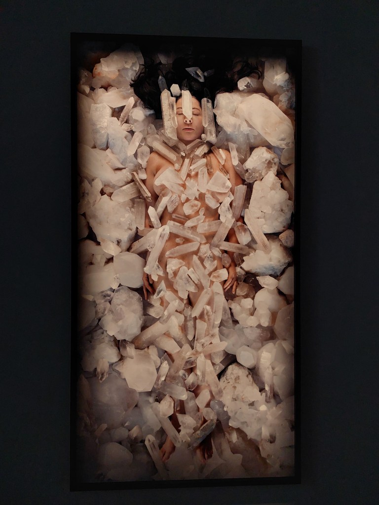 La prima immagine che ho di lei, è il suo corpo ricoperto da cristalli di quarzo, che si muovono sul viso quasi impercettibilmente ad ogni suo respiro. In Dozing Consciousness Marina Abramović riempie i polmoni e struttura il corpo, si connette al mondo esterno e comunica resilienza e resistenza.